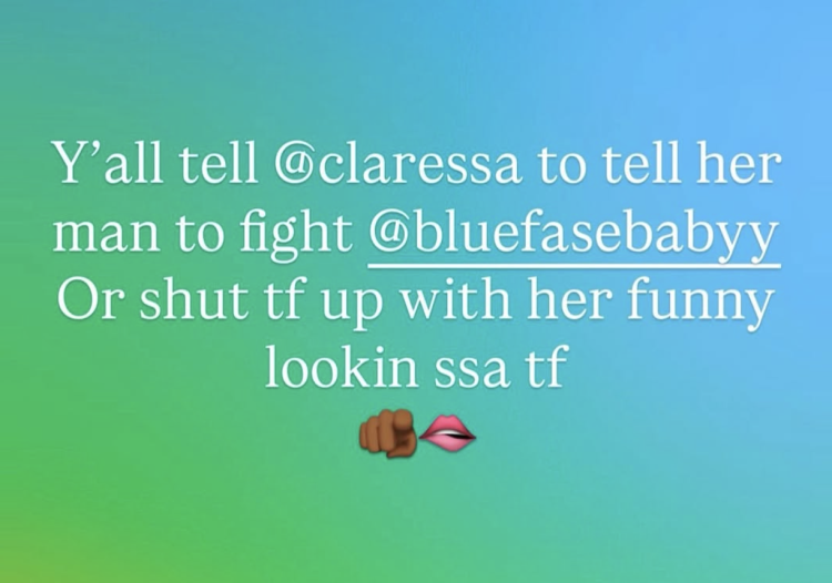 “Tell Claressa to tell her man to fight bluefasebabyy or shut tf up with her funny lookin ssa tf,” Saffold wrote online, referencing Shields’ partner, rapper Papoose.